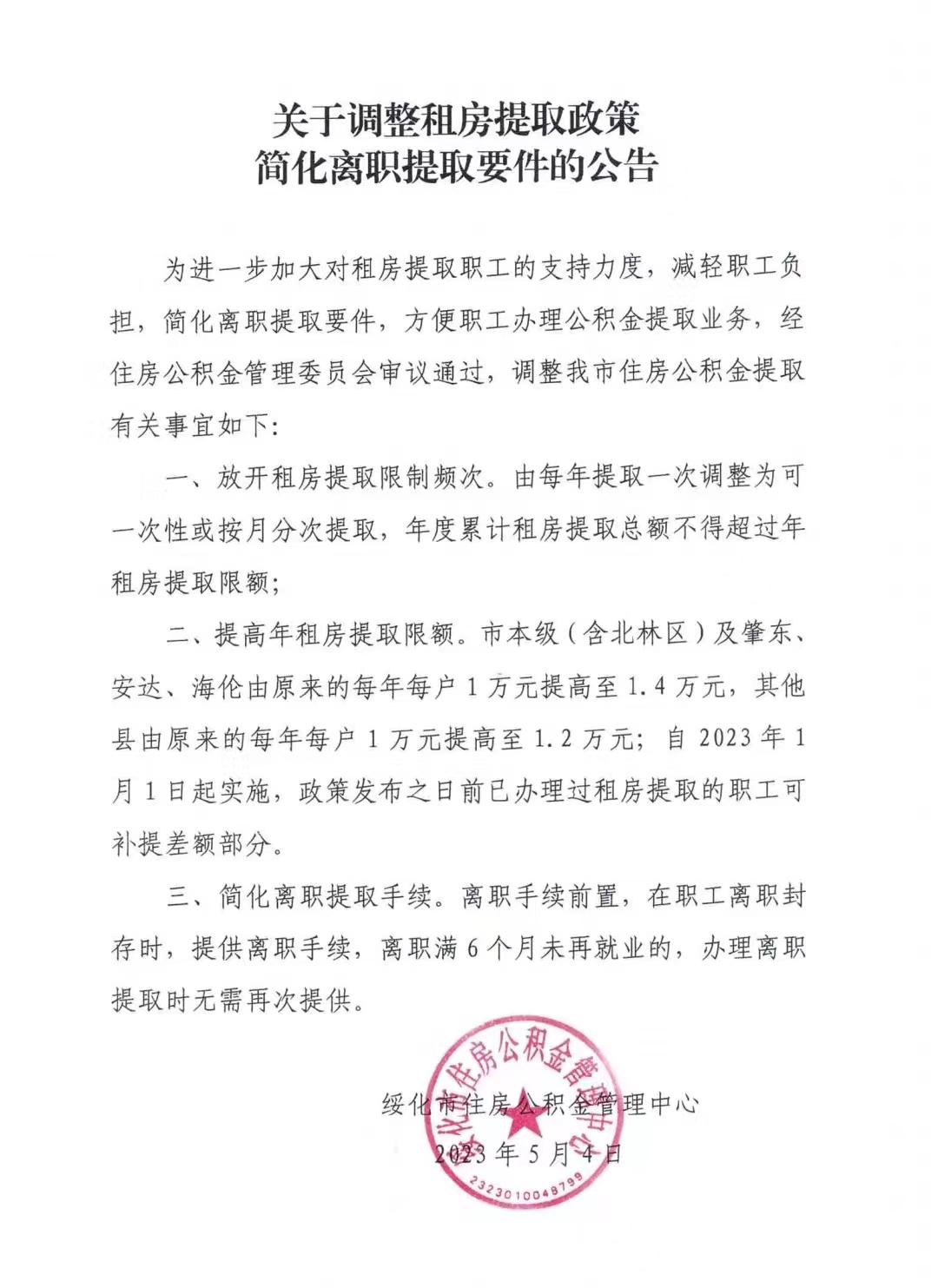 关于调整租房提取政策简化离职提取要件的公告
