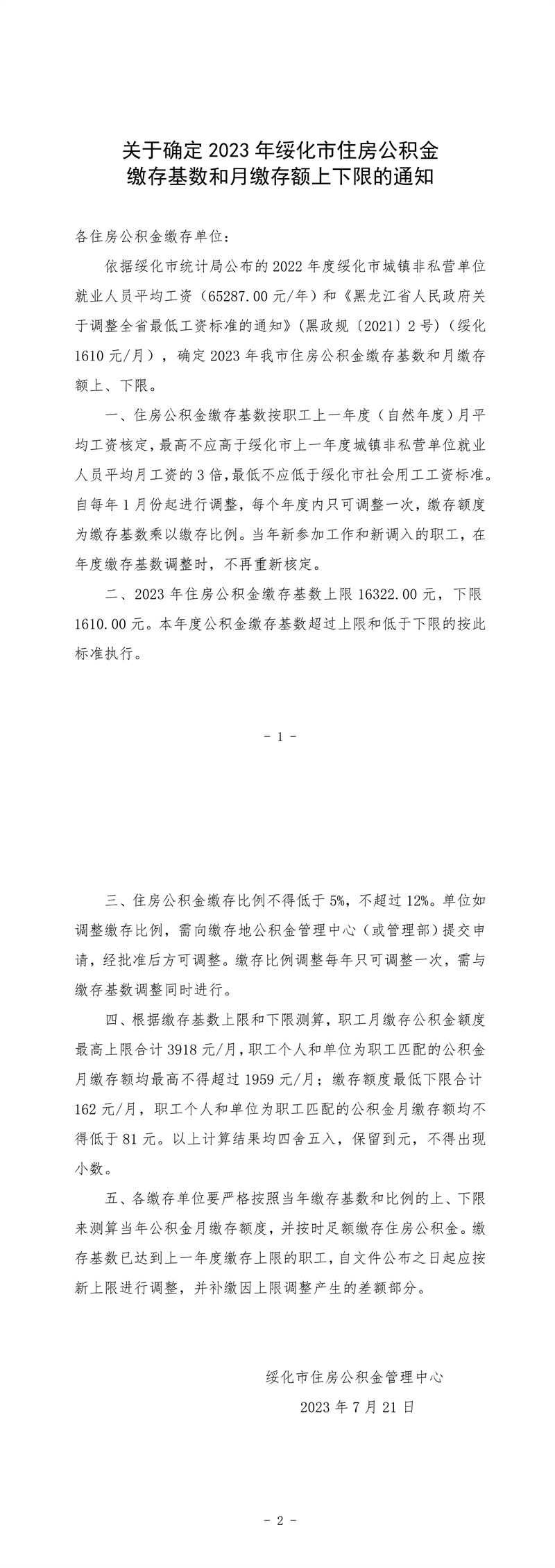 关于确定2023年绥化市住房公积金缴存基数和月缴存额上下限的通知