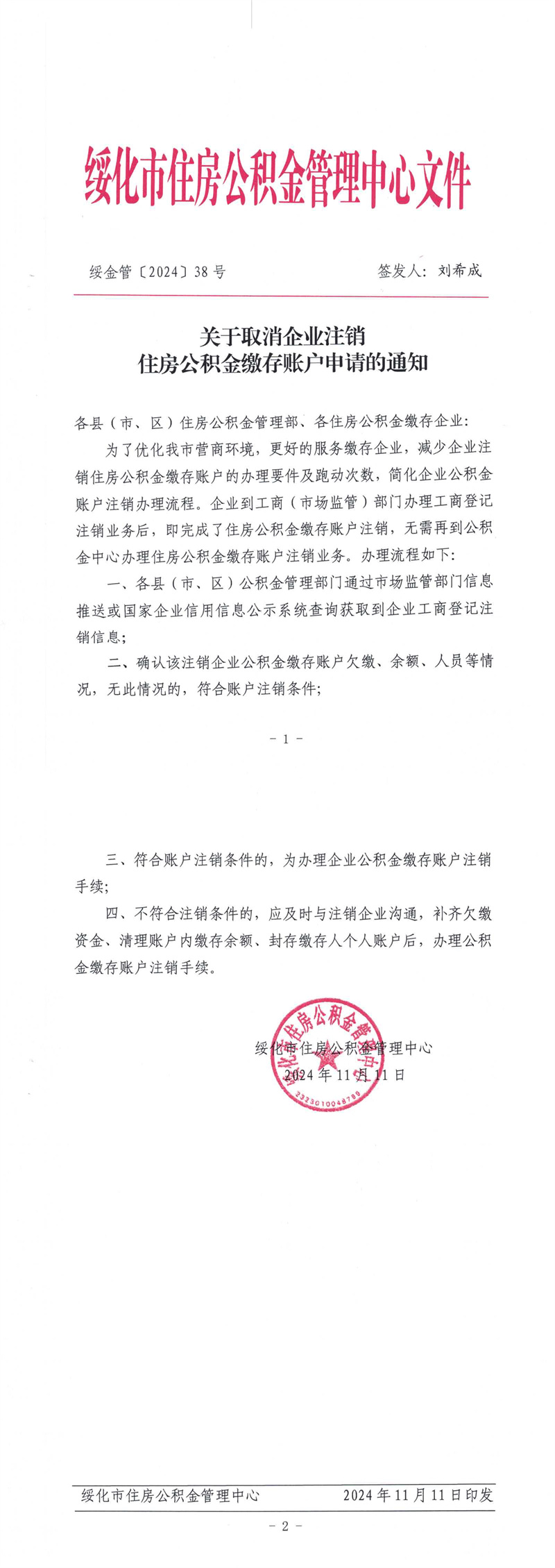 关于取消企业注销住房公积金缴存账户申请的通知(绥金管【2024】38号)